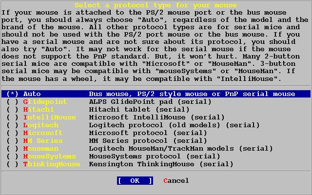 В нашем примере используется мышь PS/2, поэтому и выбираем соответственно "Auto". Чтобы изменить протокол, используйте клавиши стрелок и нажмите SPACE для выделения необходимого протокола. Затем выбирите [OK] и нажмите ENTER для выхода из меню.