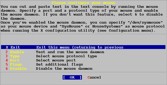 Использование 3'х кнопочной мыши позволит вам выделить часть текста экрана или программы, поместить его в буфер, чтобы затем извлечь данный текст из буфера в другом экране или программе. Если у вас 2'х кнопочная мышь, после установки внимательно прочитайте руководство (moused(8)) про режим эмуляции 3'х кнопочной мыши. В данном примере рассматривается non-USB мышь.