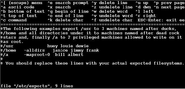 Этот редактор называется "ee". Используйте инструкции для добавления экспортируемых файловых систем сейчас или сделайте это позже. Запомните название и путь к файлу экспортов, которое увидите в нижней части экрана.