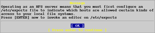 Если вы выбрали [Yes], появится сообщение указывающее на то что должен быть создан файл export содержащий информацию по экспортируемым файловым системам или директориям. Нажмите Enter для продолжения.