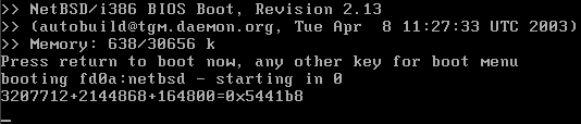 Так как статья не задумывалась в качестве исчерпывающего руководства по установке NetBSD, я выбрал cdrom, как наиболее простой путь инсталляции. Не будем осложнять себе жизнь возней с загрузочной дискетой, настройкой nfs и прочими изысками. Для того, чтобы создать загрузочный cdrom, нам нужно скачать iso - образ диска с любого из зеркальных серверов NetBSD. На момент написания статьи для скачивания была доступна версия NetBSD 1.6.1. Именно ее мы и будем использовать. Идем по адресу http://www.netbsd.org/mirrors/#iso и выбираем ближайший к нам сервер дистрибутивов. Лично я использовал работающий на удивление быстро Эстонский сервер ftp://ftp.ee.netbsd.org. Для моего PC компьютера предназначается дистрибутив, в названии которого содержится имя используемого нами процессора i386. Ну а вы, соответственно, должны выбирать дистрибутив для своего процессора. Переходим в директорию /pub/NetBSD/iso/1.6.1/ и качаем оттуда файл с образом загрузочного диска i386cd.iso размером в 125 мегабайт. Интересно, как разработчики системы смогли упаковать полнофункциональный Unix в такой малый объем. В этой же директории находятся еще восемь дисков с пакетами дополнительного программного обеспечения. Они нам пока не нужны, поэтому скачивать их не станем. В качестве бонуса можно взять файл i386pkg-cover.pdf, содержащий внутри себя картинки обложек для cdrom.