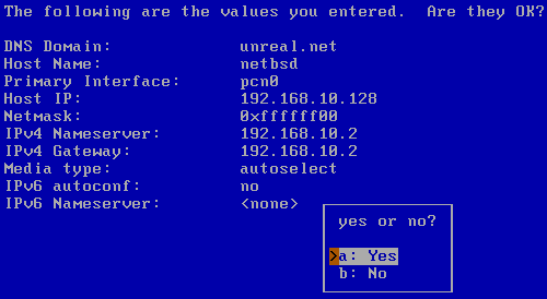 Если согласиться, то адрес TCP/IP для этого интерфейса будет получен автоматически при условии наличия в сети DHCP сервера. Вводим данные о домене и имени хоста. Я использовал в качестве имен строки "netbsd" и "unreal.net" соответственно. Так как вокруг меня нет сетей, работающих с протоколом IPv6, я отказался от его использования. И в результате получил вот такую картинку.