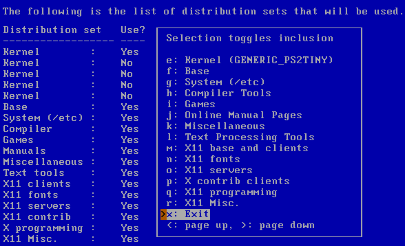 Я выбрал Normal bootblock, в ответ система немножко пожужжала диском и радостно сообщила о том, что первый этап инсталляции завершен и теперь мне необходимо выбрать наборы программного обеспечения, которые будут установлены далее. Как обычно, дают выбрать из двух наборов - Full и Custom. Повинуясь своему неуемному любопытству, решил использовать нестандартный набор пакетов. На следующем экране слева виден список выбранных пакетов, а справа меню со списком доступных для установки пакетов. Установить или снять пометку о выборе можно с помощью клавиши "Enter".