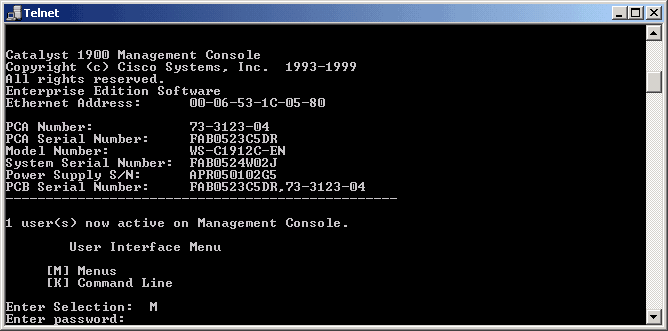 Начнём со свитчей серии 2900. Итак, вы подсоединили нуль-модемный кабель или запустили сеанс telnet. Во-первых на приглашение