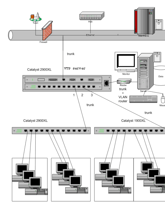 свитчи-клиенты через trunk магистрали(естественно, что для использования возможностей VTP вы должны использовать VLAN через