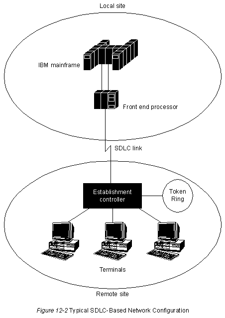 Типичная конфигурация сети, базирующейся на SDLC, представлена на Рис. 12-2. Как показано на рисунке, контроллер организации связи IBM (раньше называвшийся групповым контроллером) на отдаленном пункте подключен к "немым" терминалам и к сети Token Ring. На местном вычислительном центре главная вычислительная машина IBM подключена (через оборудование подключения каналов) к фронтальному процессору (FEP), который может также иметь связи с местными локальными сетями Token Ring и стержнем SNA. Оба пункта соединены с помощью арендуемой, базирующейся на SDLC, 56-Kb/сек линии.