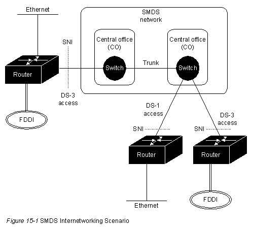 На рис.15-1 изображен сценарий межсетевого об'единения с использованием SMDS. Как показано на рисунке, доступ к SMDS обеспечивается либо через средства передачи с пропускной способностью 1.544-Mgps (DS-1 или Digital Signal 1), либо через средства передачи с пропускной способностью 44.736-Mgps (DS-3 или Digital Signal 3). Несмотря на то, что SMDS обычно описывается как обслуживание, базирующееся на волоконно-оптических носителях, доступ DS-1 может быть обеспечен либо через волоконно-оптический, либо через базирующийся на меди носитель с достаточно хорошими показателями характеристики погрешностей. Пункт разграничения между сетью SMDS частной компании- владельца сети связи и оборудованием клиента называется интерфейсом абонент/сеть (SNI).