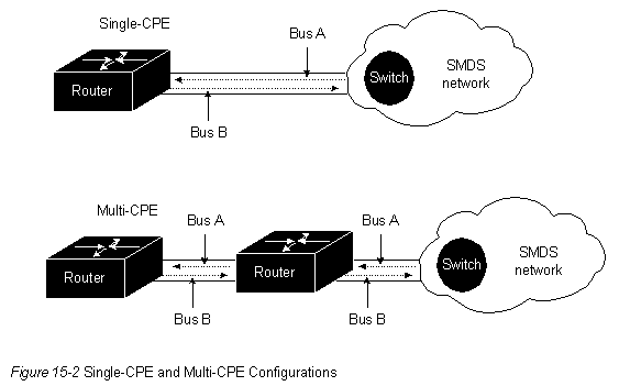 Существуют две возможные конфигурации оборудования СРЕ для получения доступа DQDB к сети SMDS (смотри рис.15-2). При конфигурации с одним СРЕ доступ DQDB просто соединяет переключатель в коммерческой сети и одну станцию, принадлежащую абоненту (СРЕ). Для конфигурации с большим числом СРЕ, доступ DQDB состоит из переключателя в сети и множества об'единенных СРЕ в местоположении абонента. Для второй конфигурации, все СРЕ должны принадлежать одному и тому же абоненту.