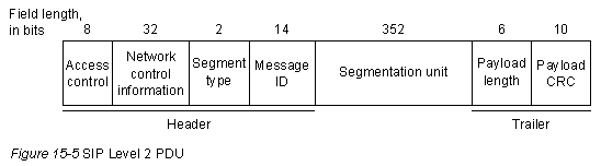 PDU уровня 3 сегментируются на PDU уровня 2 с одинаковым размером (53-восьмибитовых байта), которые часто называют "слотами" (slots) или "секциями" (cells). Формат PDU уровня 2 SIP представлен на Рис. 15-5.
