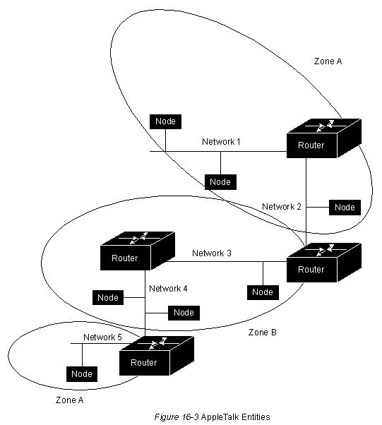 AppleTalk идентифицирует несколько сетевых об'ектов. Самым простым является узел (node), который является просто любым устройством, соединенным с сетью AppleTalk. Наиболее распространенными узлами являются компьютеры Macintosh и лазерные принтеры, однако многие другие компьютеры также способны осуществлять связь AppleTalk, в том числе компьютеры IBM PC, Digital Equipment Corparation VAX и различные АРМ. Следующим об'ектом, определяемым AppleTalk, является сеть. Сеть AppleTalk представляет собой просто отдельный логический кабель. Хотя этот логический кабель часто является отдельным физическим кабелем, некоторые вычислительные центры используют мосты для об'единения нескольких физических кабелей. И наконец, зона (zone) АppleTalk является логической группой из нескольких сетей (возможно находящихся далеко друг от друга). Об'екты AppleTalk изображены на Рис. 16-3.