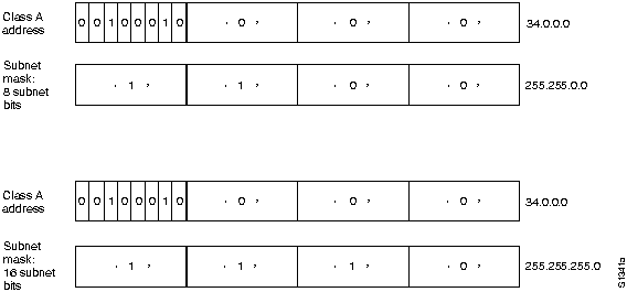 Число битов, занимаемых для адреса подсети, является переменной величиной. Для задания числа используемых битов IP обеспечивает маску подсети. Маски подсети используют тот же формат и технику представления адреса, что и адреса IP. Маски подсети содержат единицы во всех битах, кроме тех, которые определяют поле главной вычислительной машины. Например, маска подсети, которая назначает 8 битов организации подсети для адреса 34.0.0.0. класса А, представляет собой выражение 255.255.0.0. Маска подсети, которая определяет 16 битов организации подсети для адреса 34.0.0.0. класса А, представляется выражением 255.255.255.0. Обе эти маски изображены на Рис. 18-5.