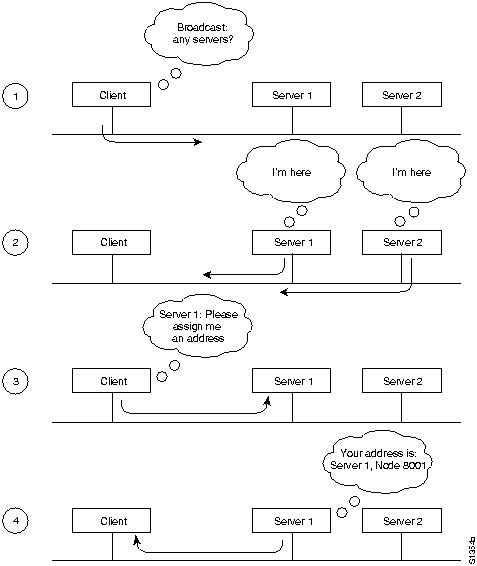 Когда какой-нибудь клиент включает питание, он направляет широковещательный запрос служебным устройствам. Все служебные устройства, которые получают этот запрос, посылают ответ. Клиент выбирает первый ответ и запрашивает у данного служебного устройства адрес подсети (хоста). Служебное устройство отвечает адресом, состоящим из его собственного сетевого адреса (полученного из его ключа), об'единенного с адресом подсети (хоста), который он выбрал сам. Адреса подсети клиента обычно назначаются последовательно, начиная с 8001H. Адреса подсети служебного устройства всегда 1. Процесс выбора адреса VINES показан на Рис. 21-3.