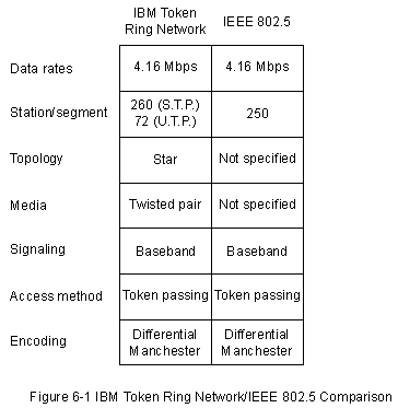 Сети Token Ring и IEEE 802.5 в основном почти совместимы, хотя их спецификации имеют относительно небольшие различия. Сеть Token Ring IBM оговаривает звездообразное соединение, причем все конечные устройства подключаются к устройству, называемому "устройством доступа к многостанционной сети" (MSAU), в то время как IEEE 802.5 не оговаривает топологию сети (хотя виртуально все реализации IEEE 802.5 также базируются на звездообразной сети). Имеются и другие отличия, в том числе тип носителя (IEEE 802.5 не оговаривает тип носителя, в то время как сети Toke Ring IBM используют витую пару) и размер поля маршрутной информации (смотри далее в этой главе обсуждение характеристик полей маршрутной информации). На Рис. 6-1 представлены обобщенные характеристики сетей Token Ring и IЕЕЕ 802.5.