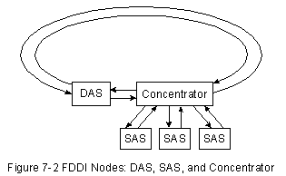 На Рис. 7-2 "Узлы FDDI: DAS, SAS и концентратор" представлена типичная конфигурация FDDI, включающая как DAS, так и SAS.