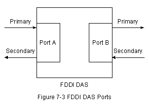 Каждая DAS FDDI имеет два порта, обозначенных А и В. Эти порты подключают станцию к двойному кольцу FDDI. Следовательно, как это показано на Рис. 7-3 "Порты DAS FDDI", каждый порт обеспечивает соединение как с первичным, так и со вторичным кольцом.