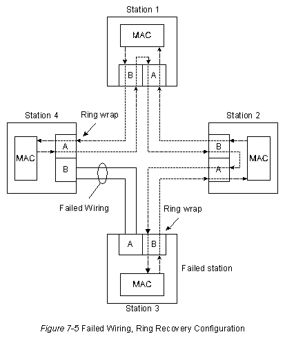 На Рис. 7-5 "Конфигурация восстановления сети при отказе кабеля" показано, как FDDI компенсирует отказ в проводке. Станции 3 и 4 свертывают кольцо внутрь себя при отказе проводки между этими станциями.