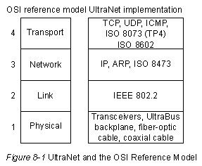 UltraNet обеспечивает услуги, соответствующие четырем низшим уровням эталонной модели OSI. На Рис. 8-1 показаны взаимоотношения между этими уровнями и реализацией UltraNet. В дополнение к перечисленным протоколам UltraNet также обеспечивает Simple Network Management Protocol (SNMP) (Протокол Управления Простой Сетью) и Routing Information Protocol (RIP) (Протокол маршрутной информации). Дополнительная информация по этим протоколам дается соответственно в Главе 23 "RIP" и Главе 32 "SNMP".
