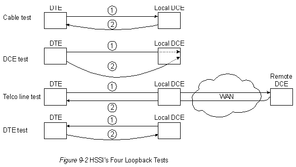 Для любого из высших уровней диагностического ввода, HSSI обеспечивает четыре проверки петлевого контроля. Эти тесты показаны на Рис. 9-2 "четыре теста петлевого контроля HSSI". Первый тест обеспечивает контроль кабеля локальной сети, т.к. сигнал закольцовывается, как только он доходит до порта DTE. Сигнал второго теста доходит до линейного порта локального DСE. Сигнал трeтьего теста доходит до линейного порта отдаленной DCE. И наконец, четвертый тест представляет собой инициируемую DCE проверку устройством DTE порта DCE.