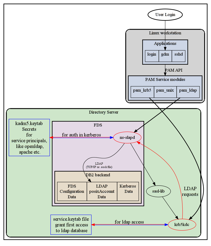 При настройке Directory Server'a возникает следующее затруднение. FDS может разрешать доступ, консультируясь с базой Kerberos. Kerberos может хранить свои данные в базе LDAP, составной части FDS. В случае если к FDS поступит запрос к данным LDAP каталога, он обратится к демону Kerberos (KD), чтобы выяснить есть ли права на доступ, а Kerberos в свою очередь запросит у FDS данные из LDAP. Решении состоит в том, что FDS будет использовать так называемый keytab file, на основании которого KD разрешит доступ. А для KD в свою очередь будет создана запись в LDAP и специальный stash-file. Фактически в обоих файлах записаны пароли. Для пояснения картины в целом прилагается схема.