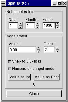 #!/usr/bin/perl -w use Gtk ; use strict ; set_locale Gtk; init Gtk; my $false = 0; my $true = 1; my $spinner1; my $window; my $frame; my $hbox; my $main_vbox; my $vbox; my $vbox2; my $spinner2; my $spinner; my $button; my $label; my $val_label; my $adj; # Создаем панель $window = new Gtk::Window( "toplevel" ); $window->signal_connect( "destroy", sub { Gtk-> exit ( 0 ); } ); $window->set_title( "Spin Button" ); $main_vbox = new Gtk::VBox( $false, 5 ); $main_vbox->border_width( 10 ); $window->add( $main_vbox ); # Создаем фрейм для неускоренного прокрутчика $frame = new Gtk::Frame( "Not accelerated" ); $main_vbox->pack_start( $frame, $true, $true, 0 ); $vbox = new Gtk::VBox( $false, 0 ); $vbox->border_width( 5 ); $frame->add( $vbox ); # День, месяц и год $hbox = new Gtk::HBox( $false, 0 ); $vbox->pack_start( $hbox, $true, $true, 5 ); $vbox2 = new Gtk::VBox( $false, 0 ); $hbox->pack_start( $vbox2, $true, $true, 5 ); $label = new Gtk::Label( "Day :" ); $label->set_alignment( 0, 0.5 ); $vbox2->pack_start( $label, $false, $true, 0 ); $adj = new Gtk::Adjustment( 1.0, 1.0, 31.0, 1.0, 5.0, 0.0 ); $spinner = new Gtk::SpinButton( $adj, 0, 0 ); $spinner->set_wrap( $true ); $spinner->set_shadow_type( 'out' ); $vbox2->pack_start( $spinner, $false, $true, 0 ); $vbox2 = new Gtk::VBox( $false, 0 ); $hbox->pack_start( $vbox2, $true, $true, 5 ); $label = new Gtk::Label( "Month :" ); $label->set_alignment( 0, 0.5 ); $vbox2->pack_start( $label, $false, $true, 0 ); $adj = new Gtk::Adjustment( 1.0, 1.0, 12.0, 1.0, 5.0, 0.0 ); $spinner = new Gtk::SpinButton( $adj, 0, 0 ); $spinner->set_wrap( $true ); $spinner->set_shadow_type( 'etched_in' ); $vbox2->pack_start( $spinner, $false, $true, 0 ); $vbox2 = new Gtk::VBox( $false, 0 ); $hbox->pack_start( $vbox2, $true, $true, 5 ); $label = new Gtk::Label( "Year :" ); $label->set_alignment( 0, 0.5 ); $vbox2->pack_start( $label, $false, $true, 0 ); $adj = new Gtk::Adjustment( 1998.0, 0.0, 2100.0, 1.0, 100.0, 0.0 ); $spinner = new Gtk::SpinButton( $adj, 0, 0 ); $spinner->set_wrap( $false ); $spinner->set_shadow_type( 'in' ); $spinner->set_usize( 55, 0 ); $vbox2->pack_start( $spinner, $false, $true, 0 ); # создаем фрейм для обновляющихся накрутчиков $frame = new Gtk::Frame( "Accelerated" ); $main_vbox->pack_start( $frame, $true, $true, 0 ); $vbox = new Gtk::VBox( $false, 0 ); $vbox->border_width( 5 ); $frame->add( $vbox ); $hbox = new Gtk::HBox( $false, 0 ); $vbox->pack_start( $hbox, $false, $true, 5 ); $vbox2 = new Gtk::VBox( $false, 0 ); $hbox->pack_start( $vbox2, $true, $true, 5 ); # Создаем ускоренные накрутчики $label = new Gtk::Label( "Value :" ); $label->set_alignment( 0, 0.5 ); $vbox2->pack_start( $label, $false, $true, 0 ); $adj = new Gtk::Adjustment( 0.0, -10000.0, 10000.0, 0.5, 100.0, 0.0 ); $spinner1 = new Gtk::SpinButton( $adj, 1.0, 2 ); $spinner1->set_wrap( $true ); $spinner1->set_usize( 100, 0 ); $vbox2->pack_start( $spinner1, $false, $true, 0 ); $vbox2 = new Gtk::VBox( $false, 0 ); $hbox->pack_start( $vbox2, $true, $true, 5 ); $label = new Gtk::Label( "Digits :" ); $label->set_alignment( 0, 0.5 ); $vbox2->pack_start( $label, $false, $true, 0 ); $adj = new Gtk::Adjustment( 2, 1, 5, 1, 1, 0 ); $spinner2 = new Gtk::SpinButton( $adj, 0.0, 0 ); $spinner2->set_wrap( $true ); $adj->signal_connect( "value_changed", \&change_digits, $spinner2 ); $vbox2->pack_start( $spinner2, $false, $true, 0 ); $hbox = new Gtk::HBox( $false, 0 ); $vbox->pack_start( $hbox, $false, $true, 5 ); $button = new Gtk::CheckButton( "Snap to 0.5-ticks" ); $button->signal_connect( "clicked", \&toggle_snap, $spinner1 ); $vbox->pack_start( $button, $true, $true, 0 ); $button->set_active( $true ); $button = new Gtk::CheckButton( "Numeric only input mode" ); $button->signal_connect( "clicked", \&toggle_numeric, $spinner1 ); $vbox->pack_start( $button, $true, $true, 0 ); $button->set_active( $true ); $val_label = new Gtk::Label( " " ); $hbox = new Gtk::HBox( $false, 0 ); $vbox->pack_start( $hbox, $false, $true, 5 ); $button = new Gtk::Button( "Value as Int" ); $button->set_user_data( $val_label ); $button->signal_connect( "clicked", \&get_value, $spinner1, 1 ); $hbox->pack_start( $button, $true, $true, 5 ); $button = new Gtk::Button( "Value as Font" ); $button->set_user_data( $val_label ); $button->signal_connect( "clicked", \&get_value, $spinner1, 2 ); $hbox->pack_start( $button, $true, $true, 5 ); $vbox->pack_start( $val_label, $true, $true, 0 ); $val_label->set_text( "0" ); $hbox = new Gtk::HBox( $false, 0 ); $main_vbox->pack_start( $hbox, $false, $true, 0 ); $button = new Gtk::Button( "Close" ); $button->signal_connect( "clicked", sub { Gtk-> exit ( 0 ); } ); $hbox->pack_start( $button, $true, $true, 5 ); $window->show_all(); main Gtk; exit ( 0 ); ### Subroutines # Toggle whether text entry should snap to the tick values sub toggle_snap { my ( $widget, $spin ) = @_; $spin->set_snap_to_ticks( $widget->active ); } # Toggle whether only numeric input is allowed sub toggle_numeric { my ( $widget, $spin ) = @_; $spin->set_numeric( $widget->active ); } # Set the number of digits displayed after the decimal point sub change_digits { my ( $widget, $spin ) = @_; $spinner1->set_digits( $spin->get_value_as_int() ); } # Get the value of the spinner and put in in a label sub get_value { my ( $widget, $spin, $num ) = @_; my $buf = " "; my $label; $label = new Gtk::Label( $widget->get_user_data() ); if ( $num == 1 ) { $buf = $spin->get_value_as_int(); } else { $buf = $spin->get_value_as_float(); } $val_label->set_text( $buf ); } # END EXAMPLE PROGRAM