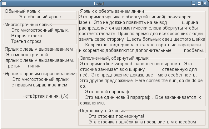 Ниже дан короткий пример для иллюстрации этих функций. Этот пример использует виджеты рамки для лучшего стиля оформления ярлыков. Сейчас вы можете проигнорировать их, но позже к ним прийдется вернуться в секции Frame.