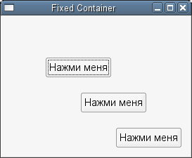 Неподвижный контейнер позволяет помещать виджеты, неподвижно в пределах окна, в позиции относительно верхнего левого угла. Позиция виджетов может быть изменена динамически.