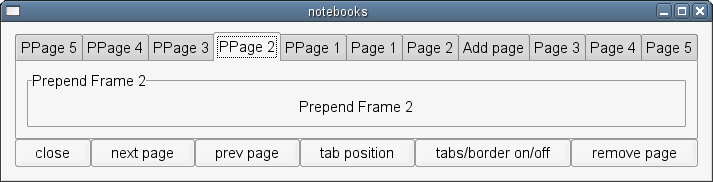 Эти функции добавляют страницы к набору в конец (append), или в начало (prepend). child - это виджет который размещен в пределах добавляемой страницы, а tab_label - это ярлык добавленной страницы. Дочерний виджет должен быть создан отдельно и может располагаться в другом виджете контейнере, например в таблице.