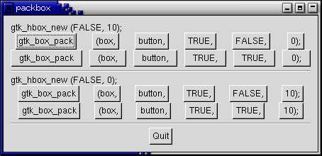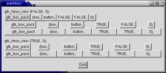 Каждая линия содержит горизонтальный контейнер (hbox) который содержит кнопки. Вызов gtk_box_pack упаковывает кнопки в контейнер hbox. Каждая кнопка упакованная в hbox имеет одинаковые аргументы для функции gtk_box_pack_start().