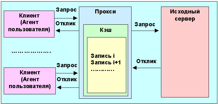 Рис. 4.5.6.1.1. Взаимодействие клиента, кэша и исходного сервера в протоколе HTTP Кэш может находиться в ЭВМ клиента или агента пользователя, но может размещаться на соседнем континенте. Число прокси между клиентом и исходным сервером может варьироваться и ограничивается сверху только здравым смыслом.