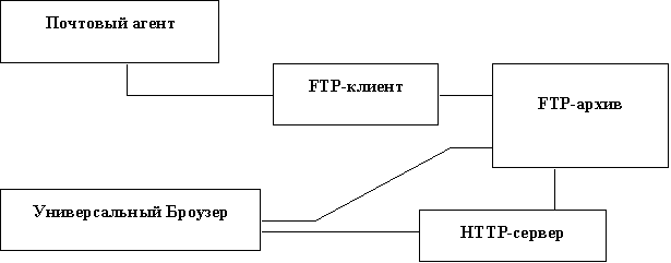 Так, например, к FTP-архиву можно обратиться через электронную почту или использовать Web-броузер для доступа к FTP-архиву. Все эти возможности предполагают использование программ-шлюзов. Если представить такое взаимодействие в виде схемы, то выглядеть это будет так, как представлено на рисунке 1.4.