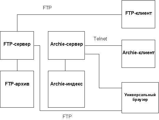 На этой схеме показано два важных технологических момента: во-первых, доступ к архиву можно осуществлять не только из специализированной программы-клиента, но и из универсального броузера, например Netscape Communicator или Microsoft Internet Explorer, а во-вторых, для поиска информации в FTP-архивах можно воспользоваться программой Archie.