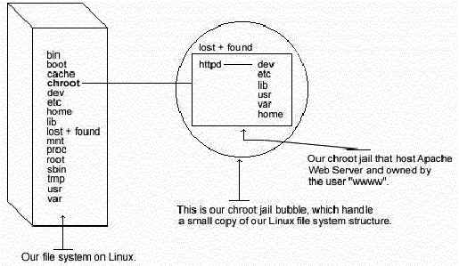 Шаг 3Установим chroot окружение. Первое, мы должны создать chroot структуру для Apache. Мы используем "/chroot/httpd" как chroot каталог для Apache. "/chroot/httpd" - это только каталог на отдельном разделе, где мы решили разместить apache для большей безопасности.