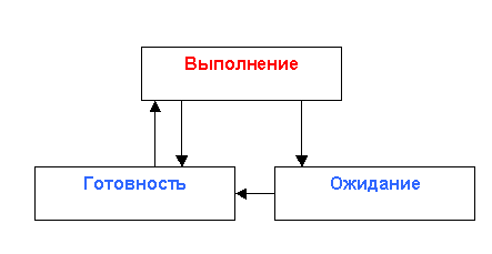Готовность - это тоже пассивное состояние, процесс тоже заблокирован, но в отличие от состояния ожидания, он заблокирован не по внутренним причинам (ведь ожидание ввода данных - это внутренняя, "личная" проблема процесса - он может ведь и не ожидать ввода данных и свободно выполняться - никто ему не мешает), а по внешним, независящим от процесса, причинам. Когда процесс может перейти в состояние готовности? Предположим, что наш процесс выполнялся до ввода данных. До этого момента он был в состоянии выполнения, потом перешел в состояние ожидания - ему нужно подождать, пока мы введем нужную для работы процесса информацию. Затем процесс хотел уже перейти в состояние выполнения, так как все необходимые ему данные уже введены, но не тут-то было: так как он не единственный процесс в системе, пока он был в состоянии ожидания, его "место под солнцем" занято - процессор выполняет другой процесс. Тогда нашему процессу ничего не остается как перейти в состояние готовности: ждать ему нечего, а выполняться он тоже не может.