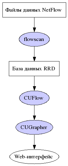 К счастью, построение графиков из RRD файлов является довольно тривиальной задачей. В состав CUFlow входит CGI скрипт, CUGrapher.pl. Скопируйте его в каталог cgi-bin вашего web-сервера. Необходимо установить две переменные: $rrddir и $organization. Параметр $rrddir указывает на каталог, где CUFlow хранит файлы RRD.