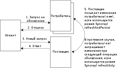 slapd(8) поддерживает репликацию, основанную на LDAP Sync, называемую syncrepl, которая может использоваться для поддержания теневых копий информации каталога на нескольких серверах службы каталога. В наиболее общем варианте такой конфигурации присутствует основной сервер-поставщик syncrepl и один или несколько подчинённых (или теневых) серверов-потребителей syncrepl. Пример конфигурации с основным и подчинённым серверами показан на рисунке 3.3. Возможна также конфигурация с несколькими главными серверами.