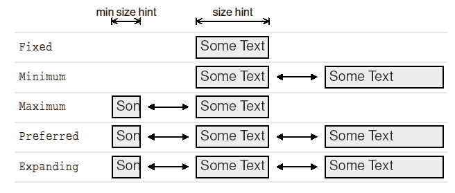 Expanding -- виджет может и растягиваться, и сжиматься, но он предпочитает растягиваться.