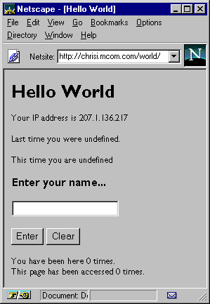 Введите своё имя и нажмите Enter. Страница теперь показывает введённое имя и текст "This time you are." Оба числа посещений увеличиваются на 1. Эта акция иллюстрирует простейшую обработку данных формы. Введите другое имя и нажмите Enter. Страница теперь показывает новое имя и текст "This time you are", а предыдущее имя с - текстом "Last time you were." И вновь оба числа посещений увеличиваются.