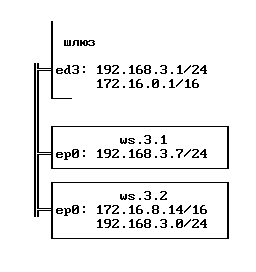 ifconfig ep0 inet 172.16.8.14 netmask 255.255.0.0 route add -net 192.168.3.0 -netmask 255.255.255.0 172.16.8.14 route add default 172.16.0.1Здесь мы присвоили интерфейсу номер из сети 172.16.*.*, а затем обьявили, что пакеты для сети 192.168.3.* надо отправлять в ту же локальную сеть.
