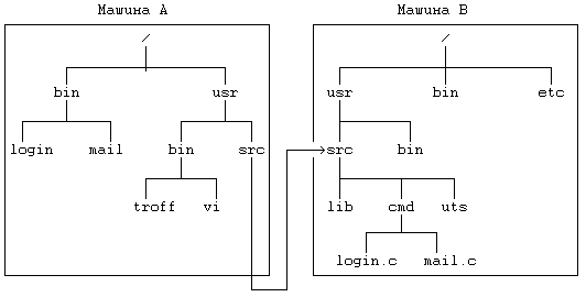 текущим каталогом станет корневой каталог, принадлежащий машине A, а не машине B. Алгоритм namei, работающий в ядре удаленной системы, получив последовательность символов "..", проверяет, является ли вызывающий процесс агентом процесса-клиента, и в случае положительного ответа устанавливает, трактует ли клиент текущий рабочий каталог в качестве корня удаленной файловой системы.