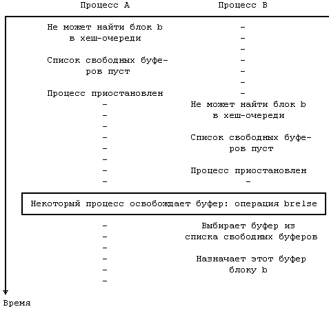 В конце концов процесс A освобождает буфер и замечает, что он запрошен. Тогда процесс A "будит" все процессы, приостановленные по событию "буфер становится свободным", включая и процесс B. Когда же ядро вновь запустит на выполнение процесс B, процесс B должен будет убедиться в том, что буфер свободен. Возможно, что третий процесс, C, ждал освобождения этого же буфера, и ядро запланировало активизацию процесса C раньше B; при этом процесс C мог приостановиться и оставить буфер заблокированным. Следовательно, процесс B должен проверить то, что блок действительно свободен.