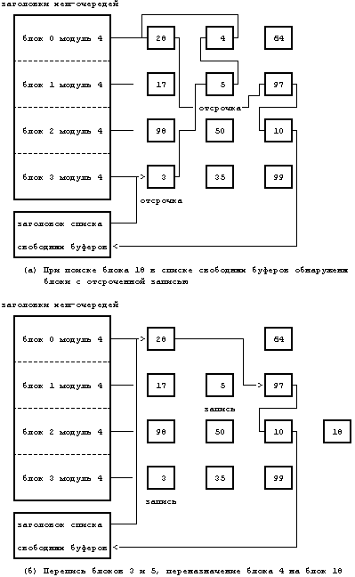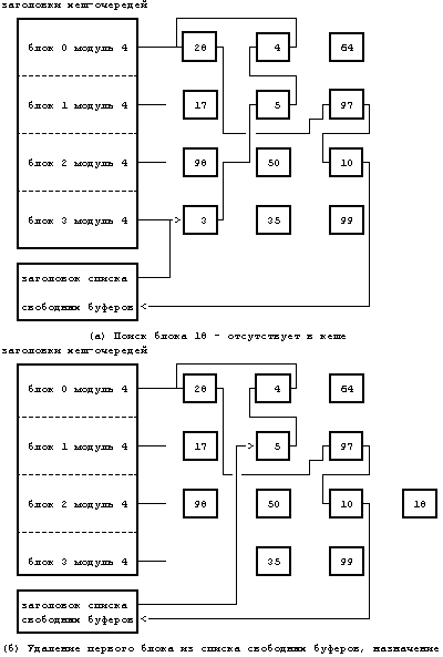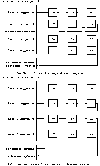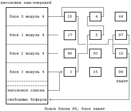 (***) Исключением является системная операция mount, которая захватывает буфер до тех пор, пока не будет исполнена операция umount. Это исключение не является существенным, поскольку общее количество буферов намного превышает число активных монтированных файловых систем.