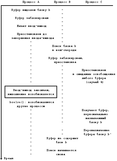 Отложенная запись отличается от асинхронной записи. Выполняя асинхронную запись, ядро запускает дисковую операцию немедленно, но не дожидается ее завершения. Что касается отложенной записи, ядро отдаляет момент физической переписи на диск насколько возможно; затем по алгоритму getblk (случай 3) оно помечает буфер как "старый" и записывает блок на диск асинхронно. После этого контроллер диска прерывает работу системы и освобождает буфер, используя алгоритм brelse; буфер помещается в "голову" списка свободных буферов, поскольку он имеет пометку "старый". Благодаря наличию двух выполняющихся асинхронно операций ввода-вывода - чтения блока с продвижением и отложенной записи - ядро может запускать программу brelse из программы обработки прерываний. Следовательно, ядро вынуждено препятствовать возникновению прерываний при выполнении любой процедуры, работающей со списком свободных буферов, поскольку brelse помещает буферы в этот список.