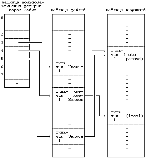Ядро может выгружать процесс, ведущий чтение, в режим задачи на время между двумя вызовами функций и планировать запуск других процессов. Так как по окончании выполнения системной функции с индекса снимается блокировка, ничто не мешает другим процессам обращаться к файлу и изменять его содержимое. Со стороны системы было бы несправедливо держать индекс заблокированным все время от момента, когда процесс открыл файл, и до того момента, когда файл будет закрыт этим процессом, поскольку тогда один процесс будет держать все время файл открытым, тем самым не давая другим процессам возможности обратиться к файлу. Если файл имеет имя "/etc/ passwd", то есть является файлом, используемым в процессе регистрации для проверки пользовательского пароля, один пользователь может умышленно (или, возможно, неумышленно) воспрепятствовать регистрации в системе всех остальных пользователей. Чтобы предотвратить возникновение подобных проблем, ядро снимает с индекса блокировку по окончании выполнения каждого вызова системной функции, использующей индекс. Если второй процесс внесет изменения в файл между двумя вызовами функции read, производимыми первым процессом, первый процесс может прочитать непредвиденные данные, однако структуры данных ядра сохранят свою согласованность.