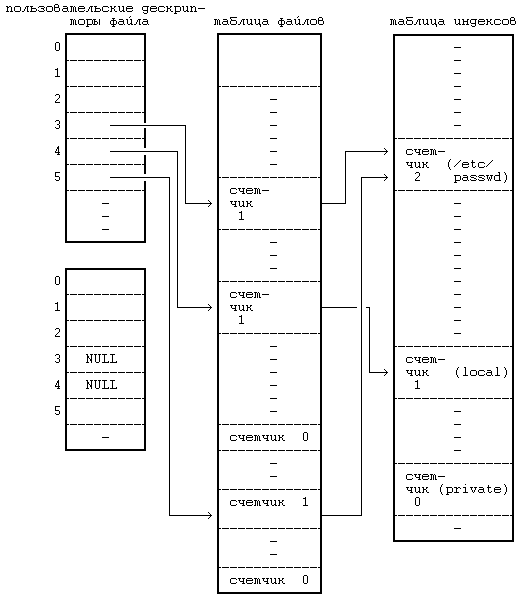 где fd - дескриптор открытого файла. Ядро выполняет операцию закрытия, используя дескриптор файла и информацию из соответствующих записей в таблице файлов и таблице индексов. Если счетчик ссылок в записи таблицы файлов имеет значение, большее, чем 1, в связи с тем, что были обращения к функциям dup или fork, то это означает, что на запись в таблице файлов делают ссылку другие пользовательские дескрипторы, что мы увидим далее; ядро уменьшает значение счетчика и операция закрытия завершается. Если счетчик ссылок в таблице файлов имеет значение, равное 1, ядро освобождает запись в таблице и индекс в памяти, ранее выделенный системной функцией open (алгоритм iput). Если другие процессы все еще ссылаются на индекс, ядро уменьшает значение счетчика ссылок на индекс, но оставляет индекс процессам; в противном случае индекс освобождается для переназначения, так как его счетчик ссылок содержит 0. Когда выполнение системной функции close завершается, запись в таблице пользовательских дескрипторов файла становится пустой. Попытки процесса использовать данный дескриптор заканчиваются ошибкой до тех пор, пока дескриптор не будет переназначен другому файлу в результате выполнения другой системной функции. Когда процесс завершается, ядро проверяет наличие активных пользовательских дескрипторов файла, принадлежавших процессу, и закрывает каждый из них. Таким образом, ни один процесс не может оставить файл открытым после своего завершения.