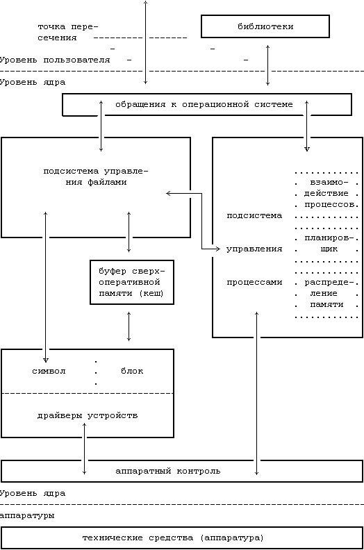 к типу запоминающих устройств с произвольной выборкой; их драйверы построены таким образом, что все остальные компоненты системы воспринимают эти устройства как запоминающие устройства с произвольной выборкой. Например, драйвер запоминающего устройства на магнитной ленте позволяет ядру системы воспринимать это устройство как запоминающее устройство с произвольной выборкой. Подсистема управления файлами также непосредственно взаимодействует с драйверами устройств "неструктурированного" ввода-вывода, без вмешательства буферного механизма. К устройствам неструктурированного ввода-вывода, иногда именуемым устройствами посимвольного ввода-вывода (текстовыми), относятся устройства, отличные от устройств ввода-вывода блоками.