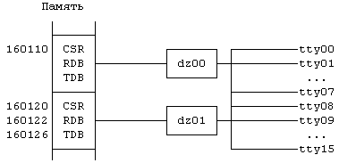 Рисунок 10.5. Отображение в памяти ввода-вывода с использованием контроллера VAX DZ11
