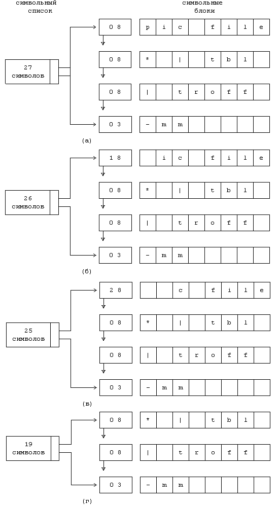 Символьные списки позволяют создать несложный механизм буферизации, полезный при небольшом объеме передаваемых данных, типичном для медленных устройств, таких как терминалы. Они дают возможность манипулировать с данными с каждым символом в отдельности и с группой символьных блоков. Например, Рисунок 10.11 иллюстрирует удаление символов из символьного списка; ядро удаляет по одному символу из первого блока в списке (Рисунок 10.11а-в) до тех пор, пока в блоке не останется ни одного символа (Рисунок 10.11г); затем оно устанавливает указатель списка на следующий блок, который становится первым блоком в списке. Подобно этому на Рисунке 10.12 показано, как ядро включает символы в символьный список; при этом предполагается, что в одном блоке помещается до 8 символов и что ядро размещает новый блок в конце списка (Рисунок 10.12г).