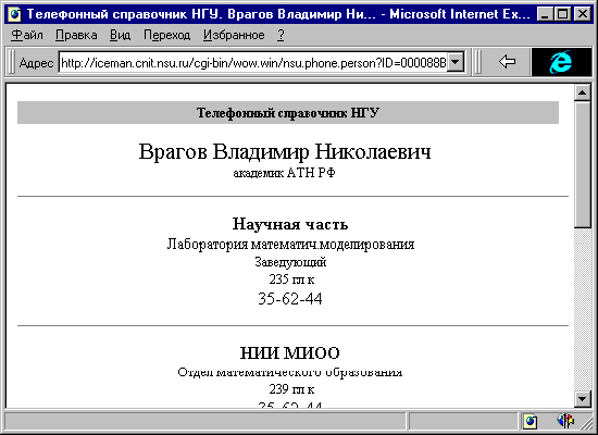 Для организации WWW - интерфейса к БД был использован пакет WOW [См. Главу 7. "Использование пакета WOW"], обеспечивающий взаимодействие WWW - сервера с SQL - сервером фирмы Oracle.