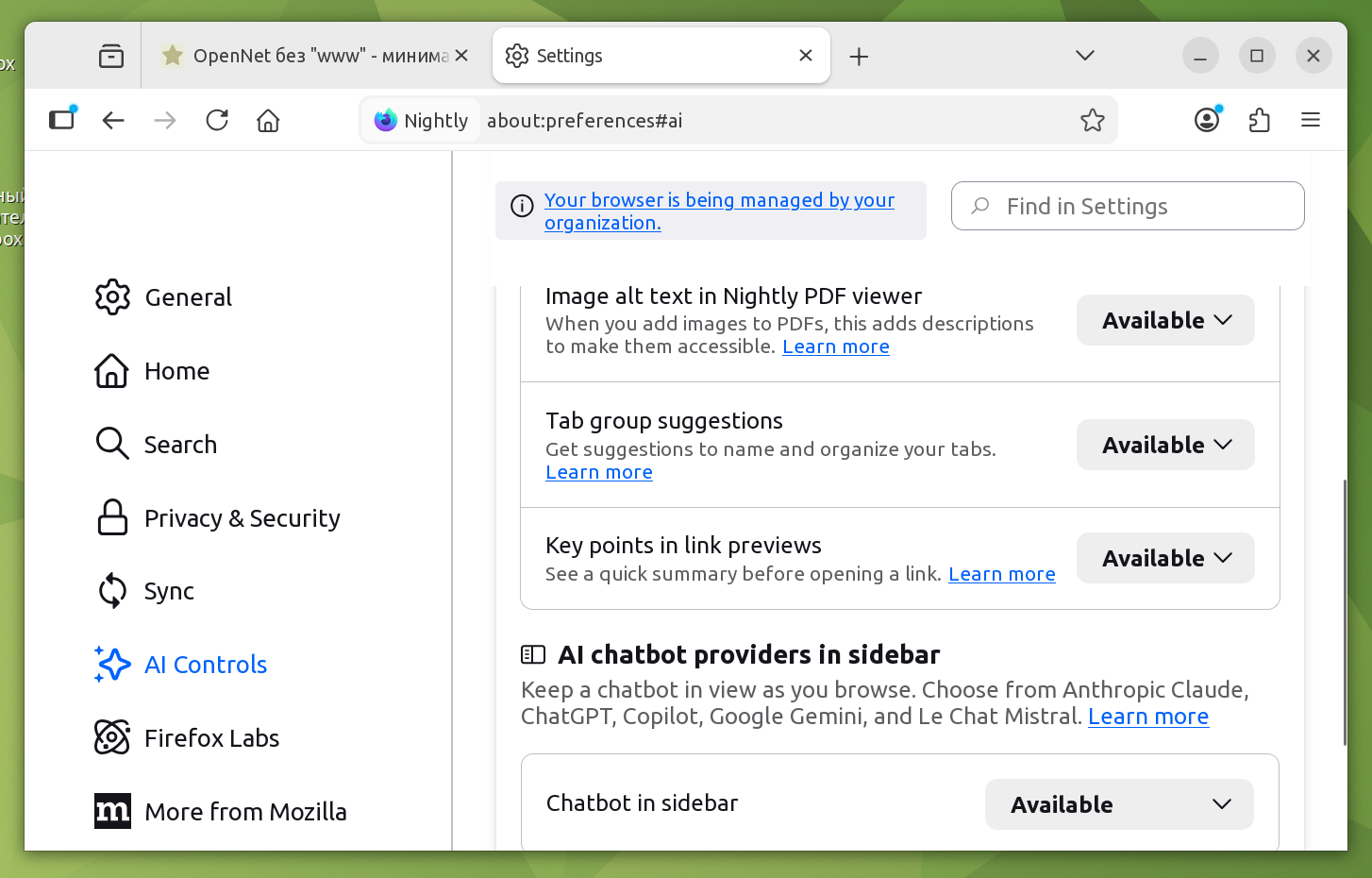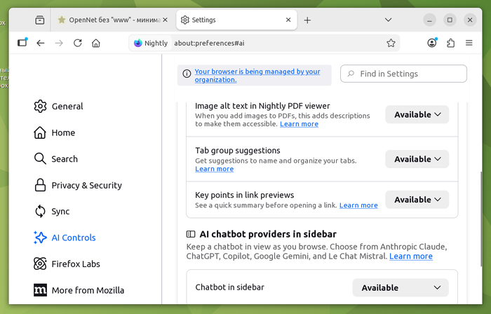 В кодовую базу, на основе которой формируется выпуск Firefox 148, запланированный на 24 февраля, добавлена ранее обещанная настройка для полного отключения всех возможностей, связанных с AI. На странице about:config появился параметр "browser.preferences.aiControls", после активации которого на странице с настройками появляется секция для управления использованием AI. На странице можно разом отключить все функции AI или выборочно активировать только необходимую функциональность.