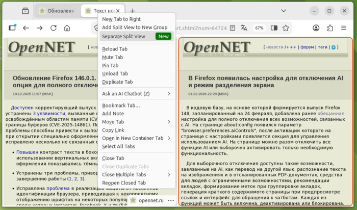 Для выборочного отключения доступны такие возможности, завязанные на AI, как перевод на другой язык, распознание текста на изображениях и в отсканированных PDF-документах, рекомендации и метки при группировке вкладок, генерация краткого содержимого страницы при предпросмотре ссылок и интерфейс для обращения к чатботам. Каждая из функций может быть включена, деактивирована или блокирована. При блокировке локально устанавливаемые AI-модели удаляются, а элементы интерфейса скрываются. ![]() Дополнительно отмечается включение по умолчанию в ночных сборках Firefox, на основе которых 24 марта будет опубликован Firefox 149, режима Split View. В данном режиме пользователь может бок о бок в одном окне просмотреть содержимое двух вкладок. В Firefox 147 режим Split View по умолчанию отключён и активируется через параметр "browser.tabs.splitView.enabled" на странице about:config, после чего в контекстном меню, показываемом при клике правой кнопкой мыши на вкладках, появится кнопка "Add Split View". При нажатии данной кнопки содержимое окна разделяется на две части и в правой части открывается содержимое страницы новой вкладки. Если выбрать опцию для группы из двух вкладок, указанные вкладки сразу будут раскрыты рядом с друг другом. Допускается произвольное изменение размера правой и левой области просмотра через перетаскивание мышью полосы-разделителя. Активная вкладка при одновременном просмотре выделяется красной рамкой. ![]() Из изменений в ночных сборках Firefox также отмечается задействование в отдельном поле для поиска, которое можно добавить на панель, тех же механизмов вывода выпадающей информации, что используются в адресной строке AwesomeBar. Кроме того, началось тестирование функции Tab Notes, позволяющей прикреплять произвольные примечания к вкладкам. ![]() ![]()